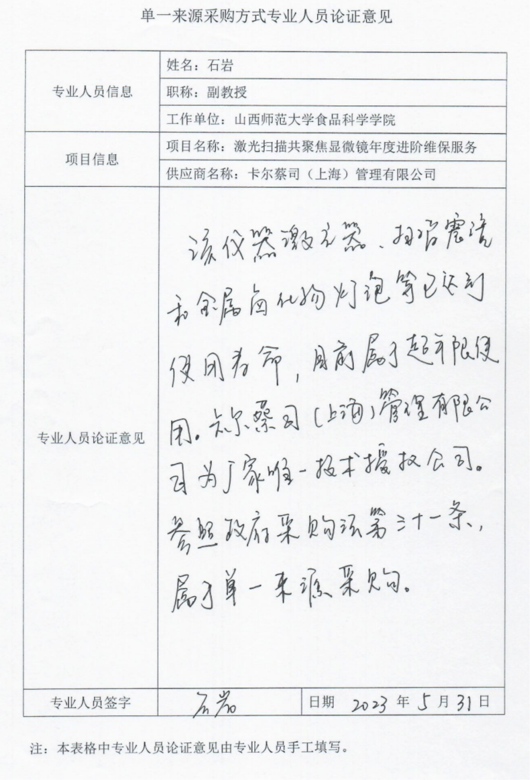 采用单一来源采购方式的原因及说明:米兰网页版_米兰(中国)大型科学仪器中心使用的激光共聚焦显微镜是德国蔡司公司专属产品,经咨询官方售后卡尔蔡司(上海)管理有限公司,维修所需配件只能使用原厂提供的,且该公司为厂家唯一技术授权公司。该产品采购符合我国采购法关于单一来源采购要求,申请此项目以单一来源方式采购。