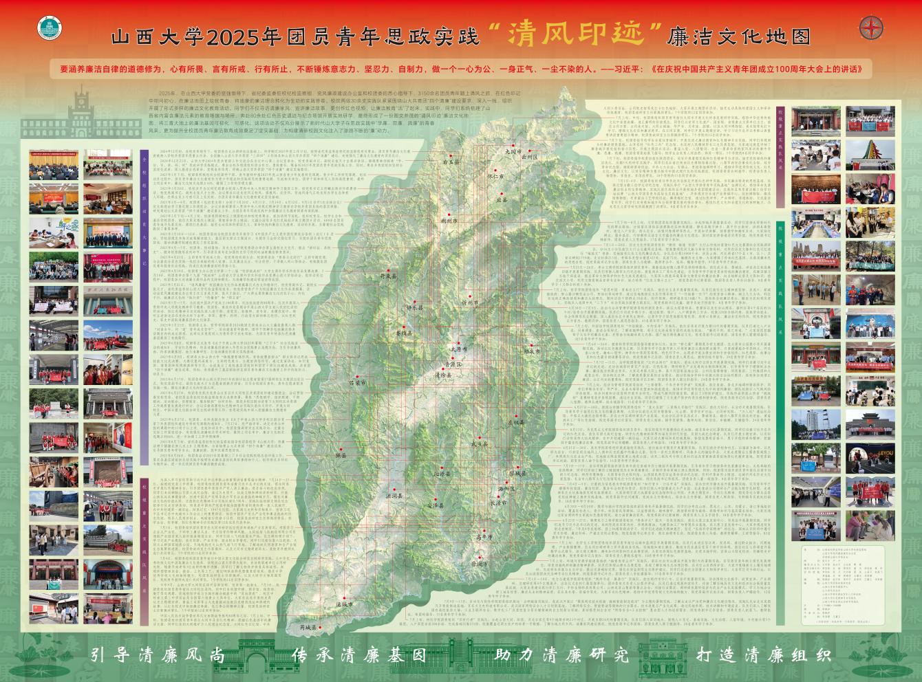 本次活动组织3150余名团员青年,组建30余支实践队广泛参与。青年学子利用课余与假期,深入三晋大地,走访省内80余处红色遗迹、廉洁教育基地与纪念场馆,通过实地研学、故事宣讲、视频创作等多种形式,将廉洁理念化为生动实践,并系统梳理形成图文并茂的“清风印迹”廉洁文化地图,实现了将三晋大地上的廉洁基因从抽象理念到可视、可感、可循的转变。