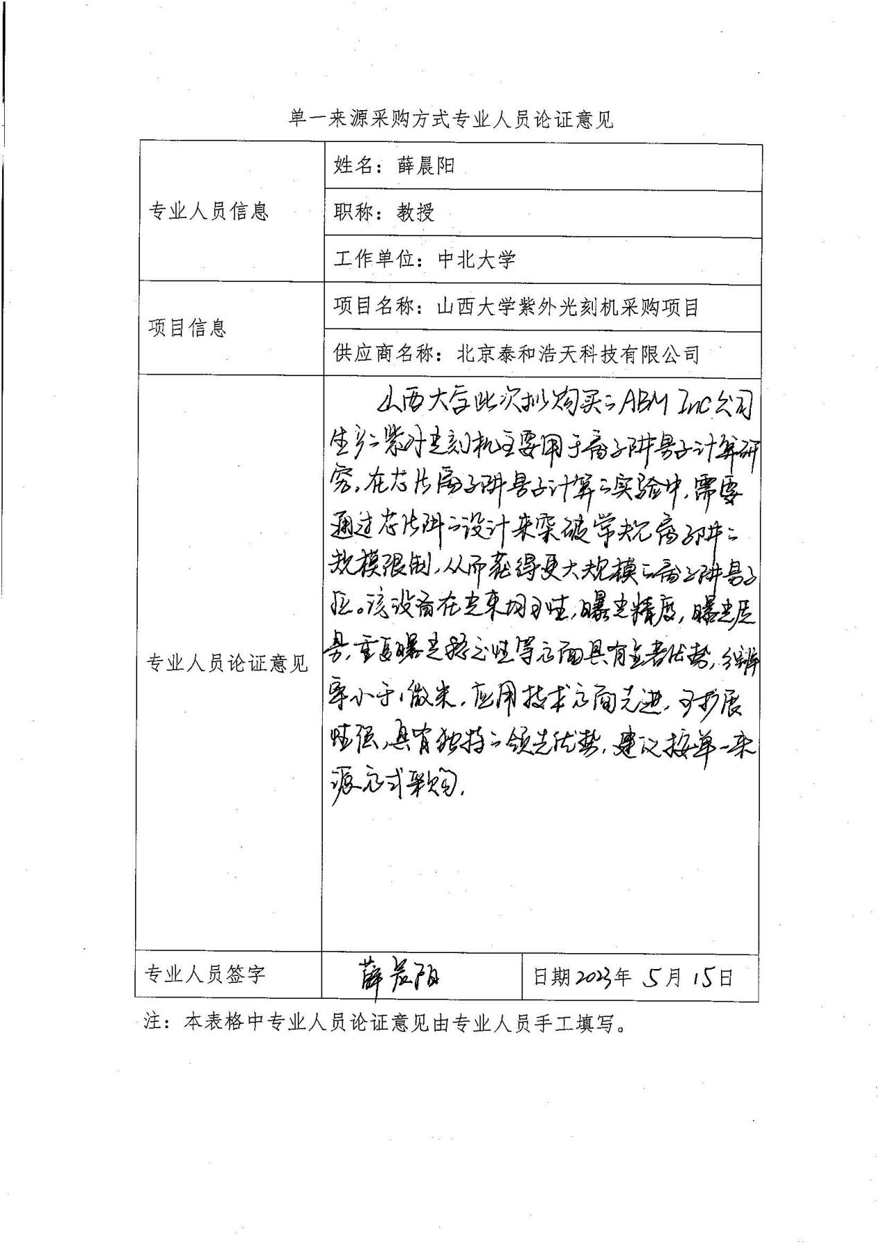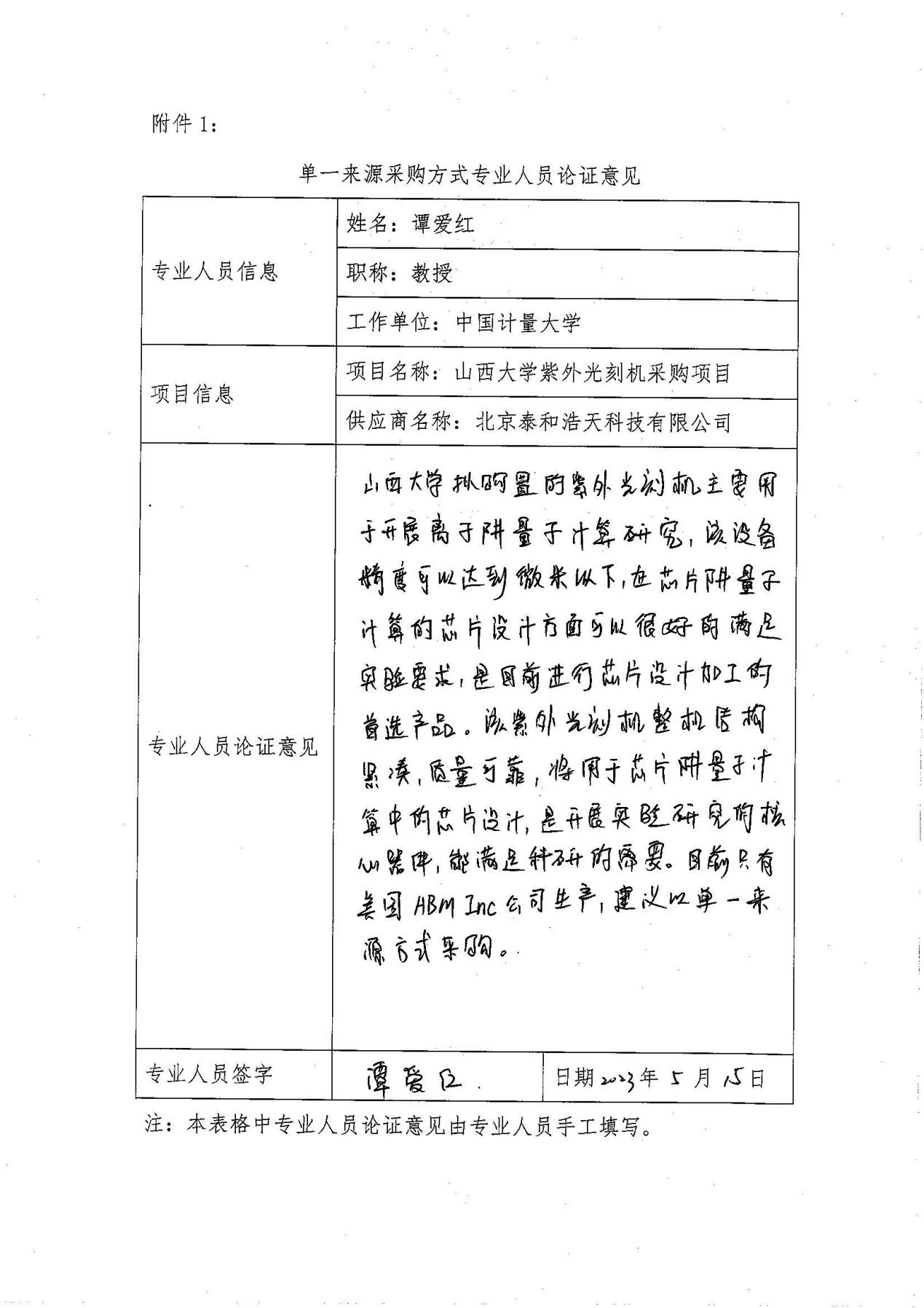 采用单一来源采购方式的原因及说明:目前满足上述参数的紫外光刻机,只有美国ABM Inc公司生产,北京泰和浩天科技有限公司是美国ABM Inc公司在中国此项目授权的唯一代理商,因此,申请以单一来源方式采购。